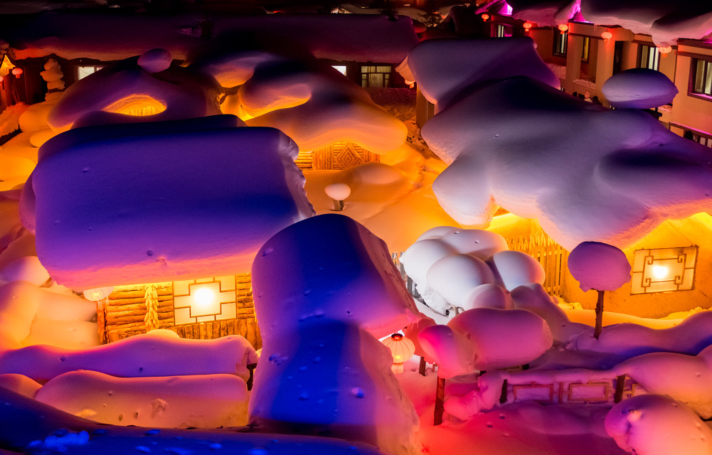 雪乡的夜景尤为美丽,洁白如玉的白雪在大红灯笼的照耀下,宛如朵朵白云飘落人间,幻化无穷……