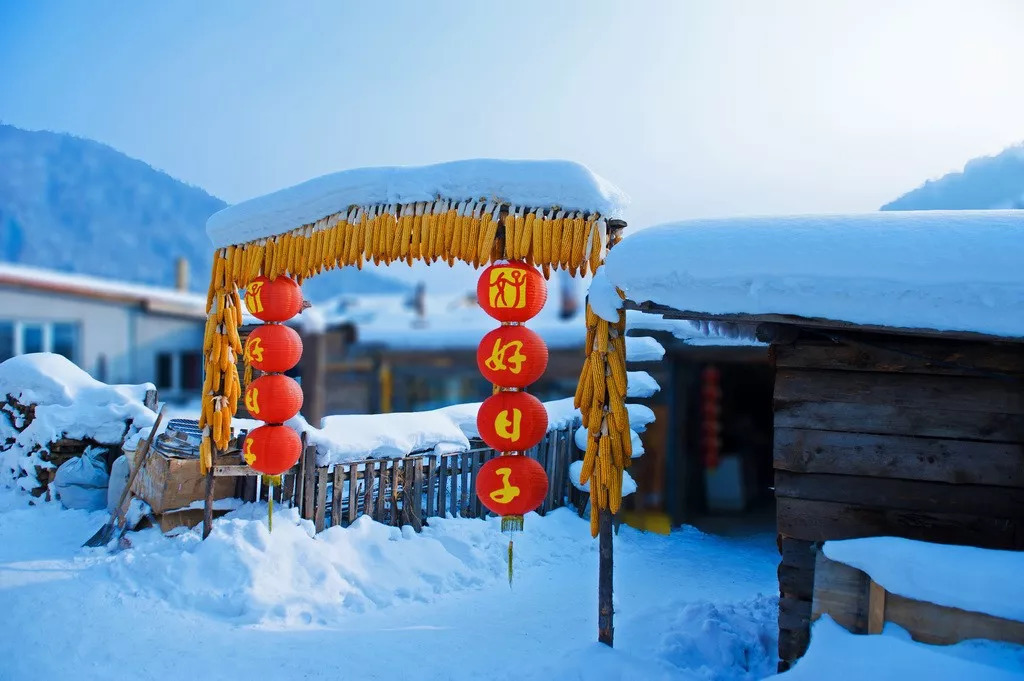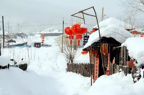 厚厚的积雪和破旧的木门,点缀着黄色的玉米和红色的灯笼,浓浓的东北乡村之气。