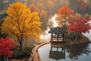 水上红叶,山岭、湖畔披上了色彩斑斓的秋装,深绿、金黄、橙红等色彩构成了一幅生动的秋日画卷,让人沉醉其中。