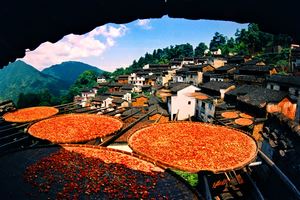 篁岭以其独特的梯田地势与白墙黛瓦的徽派建筑群交相辉映,秀气而瑰丽。秋晒稻谷、辣椒……,五颜六色的作物,衬托着徽派古建的粉墙黛瓦,绘就出世界独一无二的“晒秋”农俗景观。