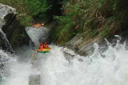 2:进士河漂流最好玩!全程落差最大187米,其中单个最大落差38米,单个最长滑道120米。全程大小落差42处,险滩35处,均匀分布,100分钟连续冲滩不间断,惊险刺激!