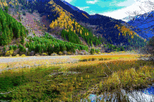 九寨沟的水因流经石灰岩而含有很多钙质,由于九寨沟的湖比较深,所以钙华坝不多见,而是形成“面包树”的奇特景色。九寨沟湖水清澈透亮,湖底倒落的树木清晰可见。不过仔细一看,会发现水中的树枝又粗又圆,与“法国长棍”面包十分相似。