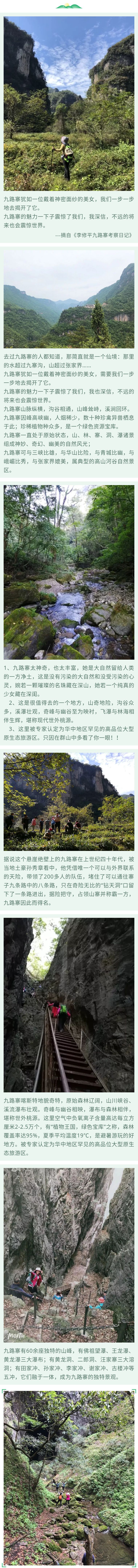 早上早餐后从村委会出发走王家槽下河,沿河上途经日天峰,九天飞瀑,滛池处午餐后上天梯,过天桥,进霸王洞,然后回村委会食宿。其间山脉纵横、沟谷相连,山峰耸峙,溪涧回环,奇峰与幽谷互为映衬,飞瀑与林海相伴生辉。最后到达山水秀美、风景如画,堪称现代世外桃源的九路寨村。
