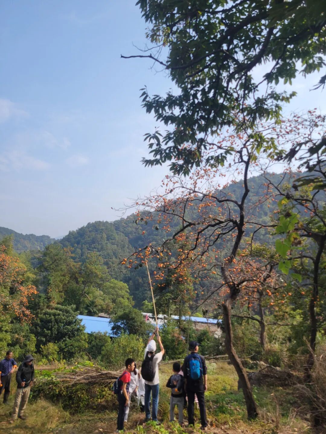 13:00大家伙一起合作打柿子,体验秋收的快乐;