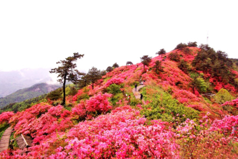 黄狮寨海拔960米,地处安徽省金寨县。寨四周的古杜鹃群面积达300多亩,每年4-5月,来到黄龙寨,放眼望去,漫山遍野火红的杜鹃花竞相开放,犹如一片杜鹃花海,在蓝天白云的映衬下显得格外绚丽。初步探查,这里的杜鹃树龄长、树蔸大、树冠高、树林密实属罕见。