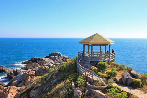 08:00集体早餐后,前往,码头乘坐快艇,登桃花岛,日照唯一海上小岛屿,岛上可赶海拾贝,有杂技表演。