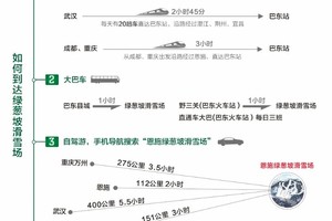 动车:动车直达,平均每天有20趟火车从武汉到巴东站(或者建始高坪站),下火车后约1小时车程直抵滑雪场。