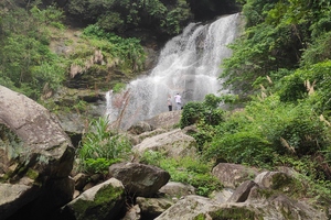 又往前走是一深潭,潭深不见底,不远处是数丈的瀑布,瀑如飞练,溪从高处泻下,银珠四溅,瀑声如雷,震荡山谷,蔚为壮观。