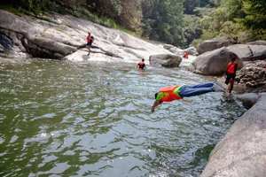 飞岩河位于麻城市张家畈镇屈家畈村境内,这里地势复杂,山岚叠嶂,风景秀丽,气候宜人,山谷中溪涧蜿蜒,奇石怪滩,流水潺潺,瀑布飞泻、响彻山谷,森林茂密、绿荫葱葱。全程线路4公里,水线路2公里,有四五个大潭可以跳潭玩水