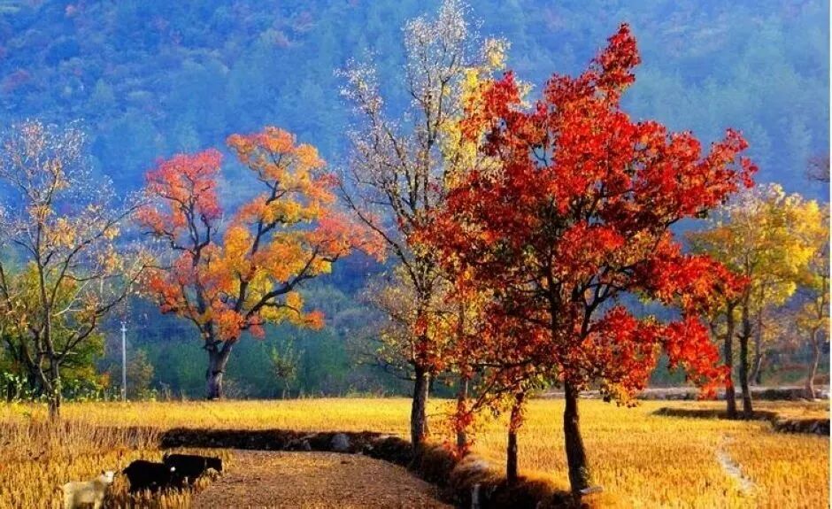 只见一层层梯田稻浪翻滚,而田埂上的乌桕树,翠绿的叶子也变成火红,像一把把向天燃烧的火炬,与黛青色的远山和山间白云,一掠飞过的小鸟,组成了一曲美妙无比的秋季田园风光。