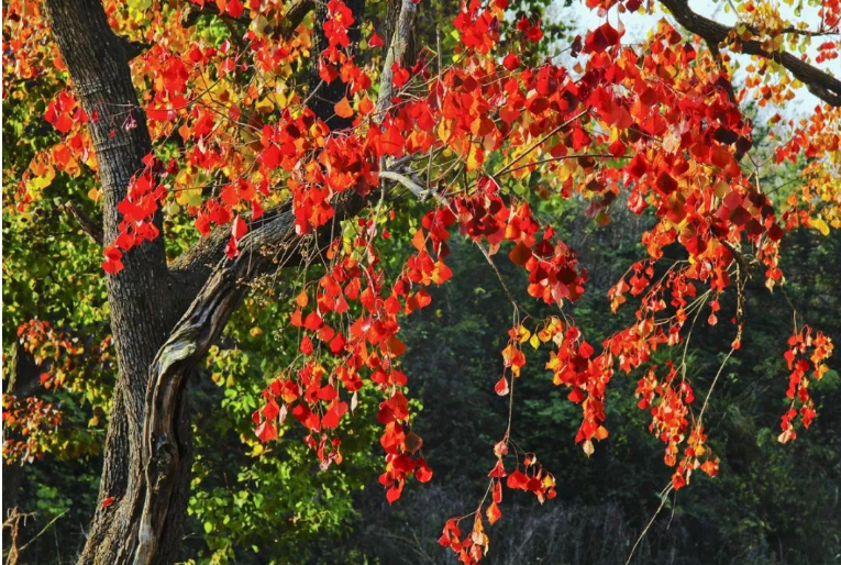 每到深秋,九资河镇漫山遍野的乌桕树叶,在阳光的照耀下,在白云的抚摸下,越发艳丽,越发娇滴滴,艳丽得那色彩仿佛要滴下来。