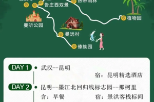 今天武汉出发指定酒店集合(出发前告知酒店名称和地址办理入住)。到达酒店办理入住后自由活动,大家可以到翠湖、陆军讲武堂、美丽的云南大学看看,也可以去南屏步行街、金马碧鸡坊逛逛,还可以去看看滇池和西山。晚上可以品尝云南特色美食,还有好吃的过桥米线(过桥米线昆明正宗品牌:桥香园或建新园)!活动时请注意安全。