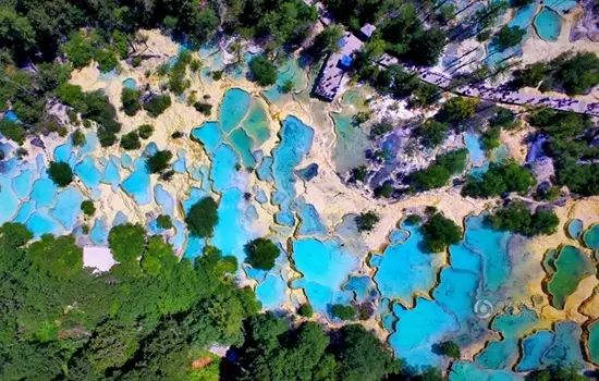 其实黄龙也被称为黄龙沟,从最顶端的五彩池,一直到山谷底部,从瑶池、瀑布、钙化池...形态非常多样,这样的景色也只有在黄龙才可以看到