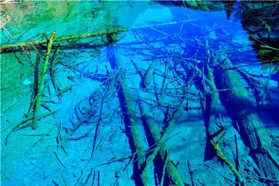 九寨沟的水因流经石灰岩而含有很多钙质,由于九寨沟的湖比较深,所以钙华坝不多见,而是形成“面包树”的奇特景色。九寨沟湖水清澈透亮,湖底倒落的树木清晰可见。不过仔细一看,会发现水中的树枝又粗又圆,与“法国长棍”面包十分相似。