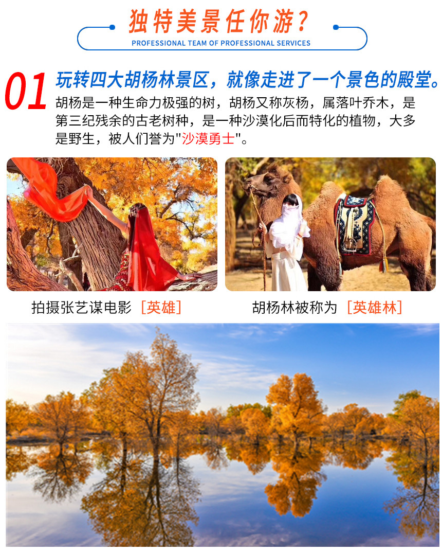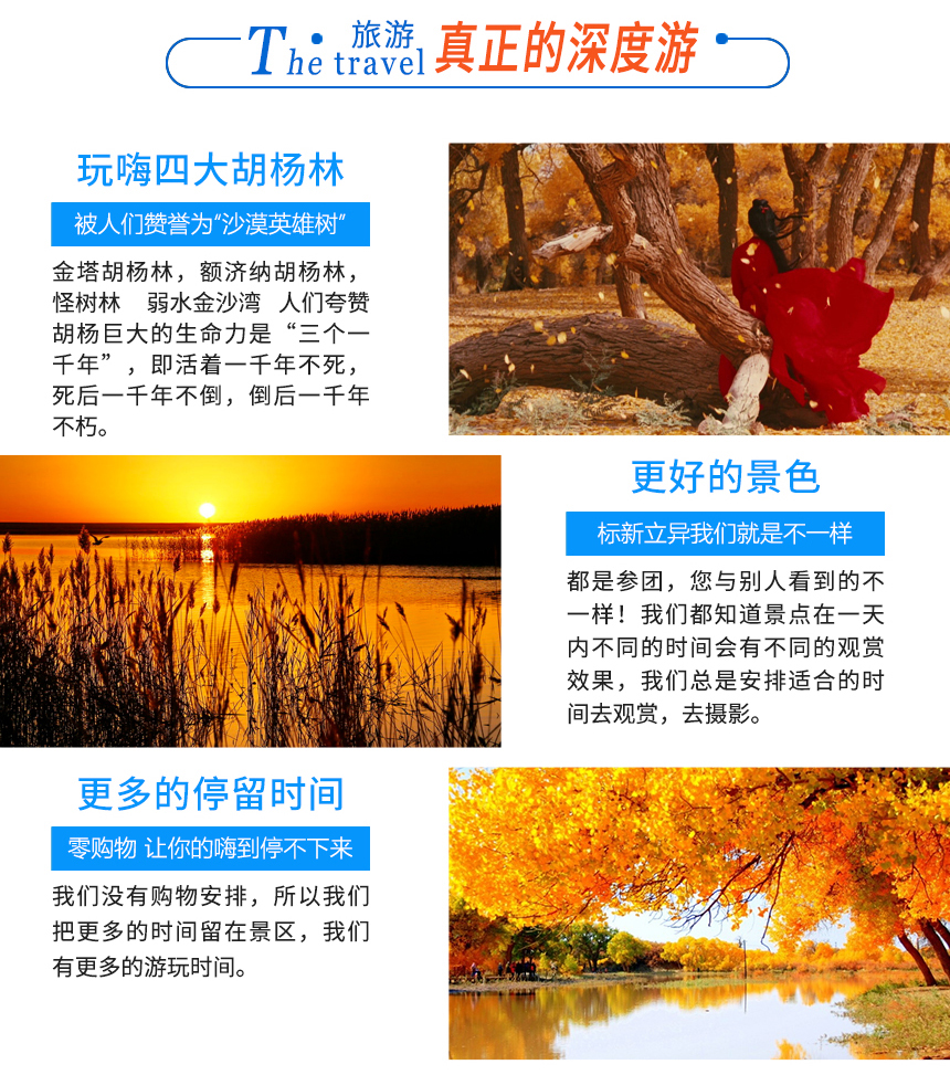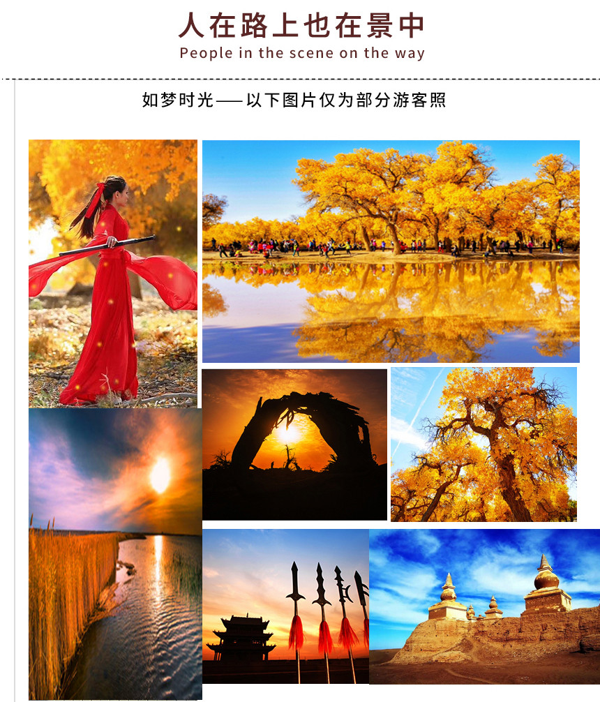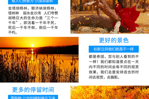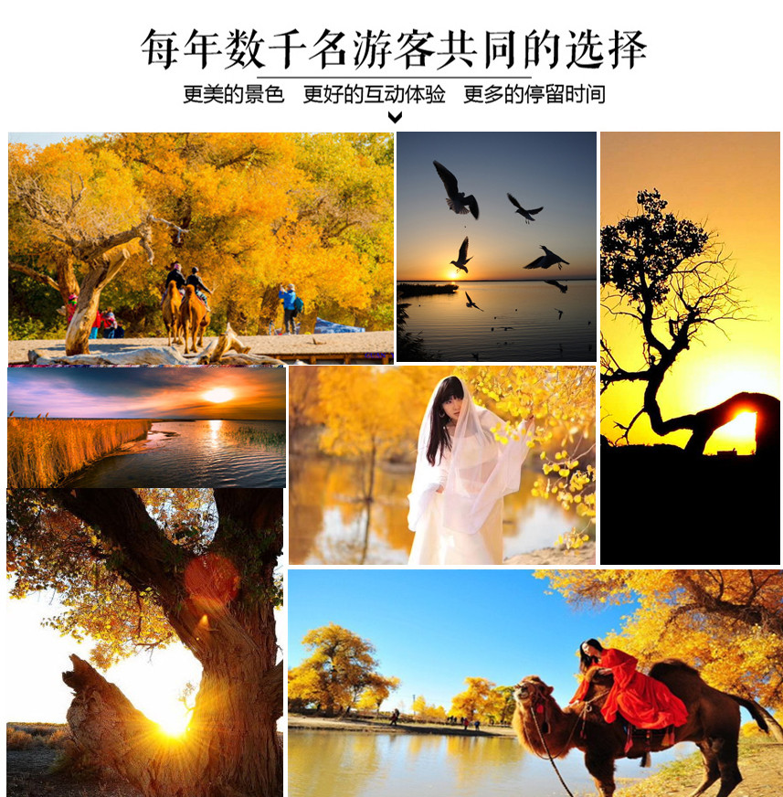 3、全程让大家观赏二次日出(居延海日出、胡杨林日出)、两次日落(大漠胡杨日落、额济纳胡杨林),有充裕的时间让大家尽情的拍照,尽情的享受额济纳旗胡杨林的美景!