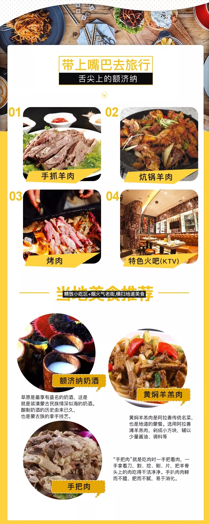 这里的日落在七点半左右,可以在【八道桥】和中国最美的沙漠【巴丹吉林沙漠】来个亲密接触。观赏【巴丹吉林沙漠日落】。尽情享受沙漠带来的独特乐趣,滑沙、骑骆驼、沙漠越野、摆pose等等,让我们一起嗨起来吧。日落西下,我们前往镇子上寻找美食。