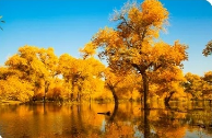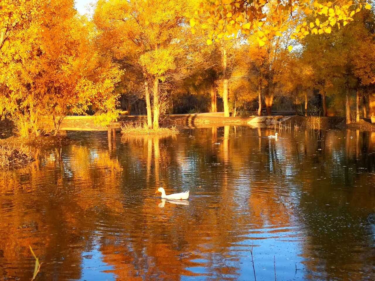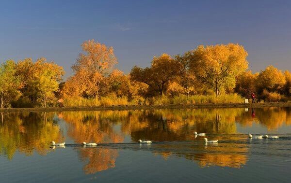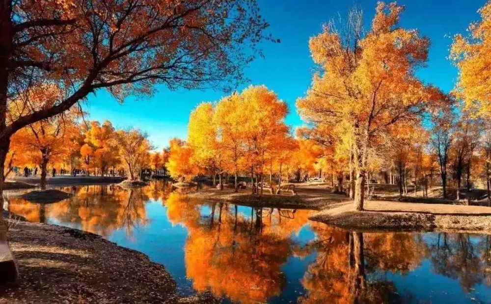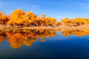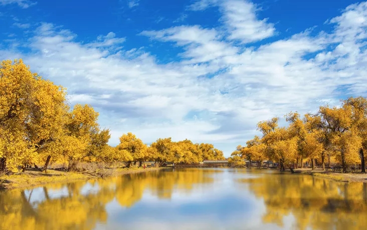二道桥:额济纳旗黑河东岸,这里有水。沿岸的胡杨映出金色的倒影,蔚蓝的天空,倒影于河水之上。《英雄》电影拍摄外景地观光拍摄,观赏“晚霞撒余晖,胡杨染金秋”壮美之景。
