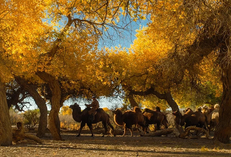 四道桥:胡杨林疏密有序,题材多。四道桥老树窝金色胡杨林,这里有林中蒙古族牧民居住,有洁白的羊群和金色的胡杨,呈现着安逸的牧人生活场景。