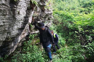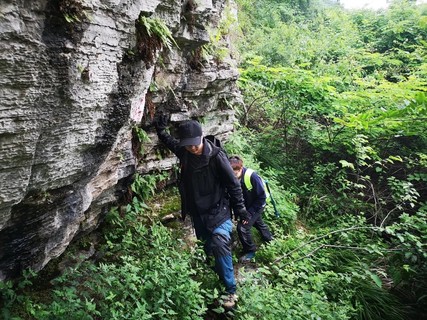 养生道以爬岩壁为亮点,是集攀岩,藤蔓,爬洞于一体的趣味性和刺激性较强的一条线路。山路斜窄,沟坎凹凸,怪石嶙峋,有的地方呈垂直状,需要手脚并用,四周你可以找到山石,树干,树枝,甚至结实的藤根都是最好的抓点,整个身体连同大脑都动了起来。