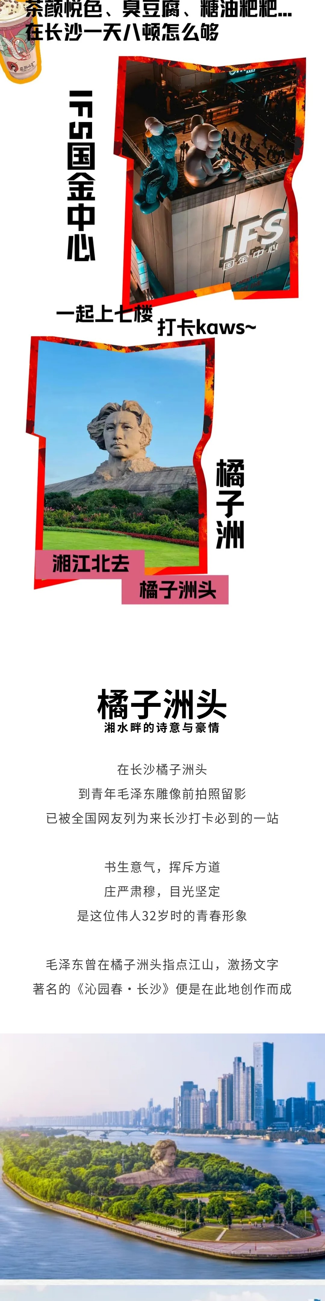 10:30抵达长沙游玩橘子洲头景区后,自由参观游览~也可在橘子洲头景区乘地铁前往五一广场地铁站,打卡五一广场、IFS国金中心、黄兴步行街、坡子街、太平街....从臭豆腐的“真香警告”到小龙虾的“辣到跳脚”这条gai(街)上的每一口,都是弗兰人的快乐密码!
