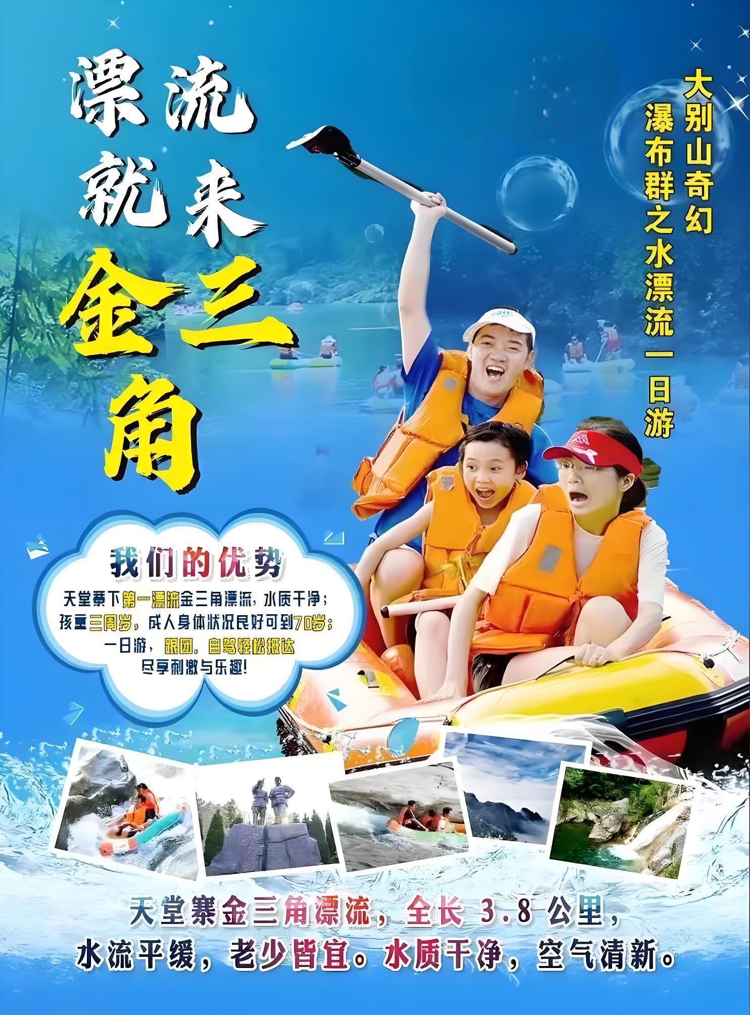 金三角漂流设有上、中、下三站,漂流全长6000多米,落差100多米,形成了气势磅礴的急流。大面积的原始森林渗透出甜美的山泉,产生大量的空气负氧离子,清新怡人,益身养颜