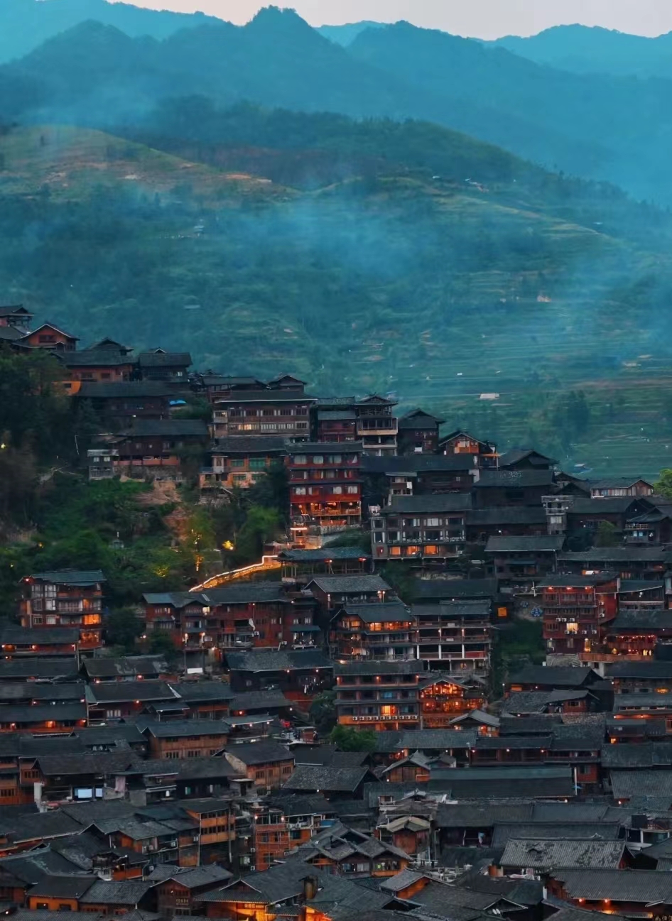 吃完晚餐,大家自由安排时间,建议大家乘景区交通车上到山顶,饱览西江千户苗寨全景。
