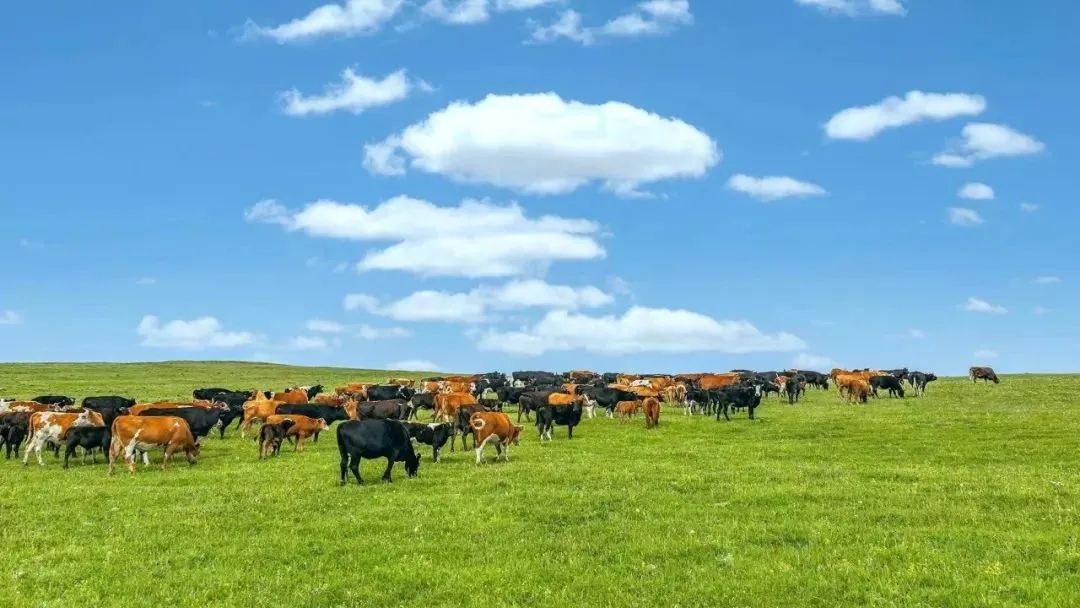 不远处,成群的牛羊如散落的珍珠般点缀在草原上,它们或悠然吃草,或闲适漫步,偶尔抬头哞哞咩咩几声,仿佛在诉说着草原生活的惬意。