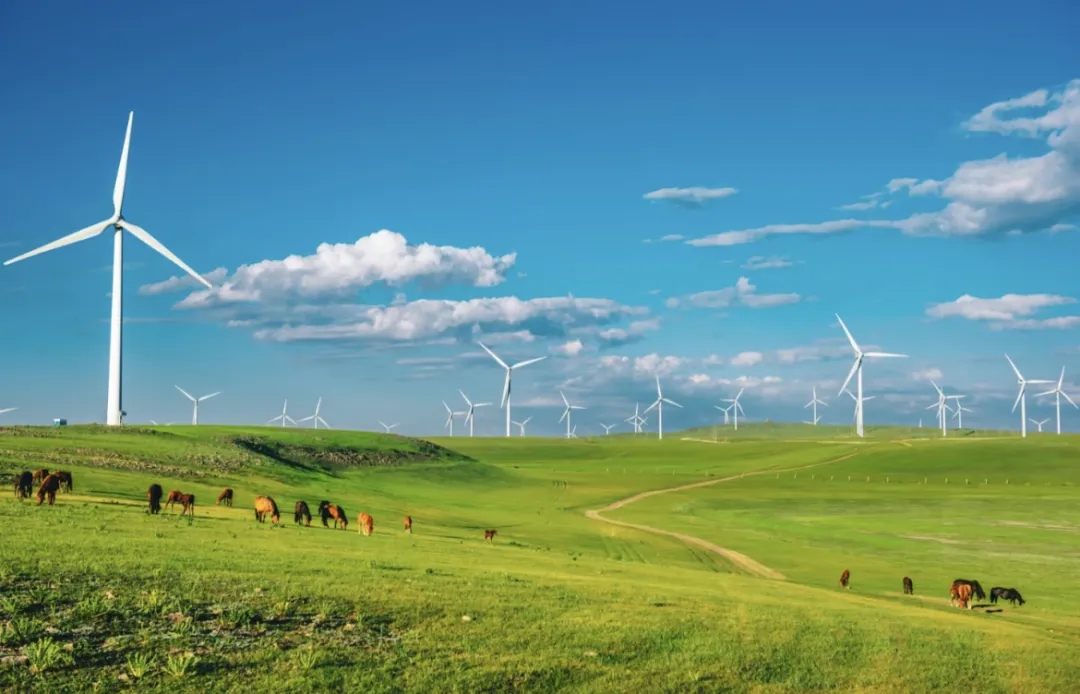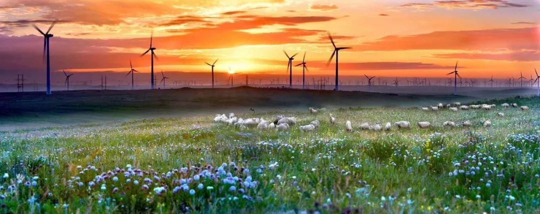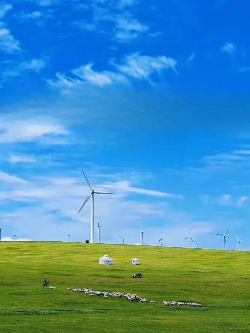我们放眼过去,绿野上的白色风车旋转,星点的牛羊、壮阔的云朵,仿佛童话里的风车草原。