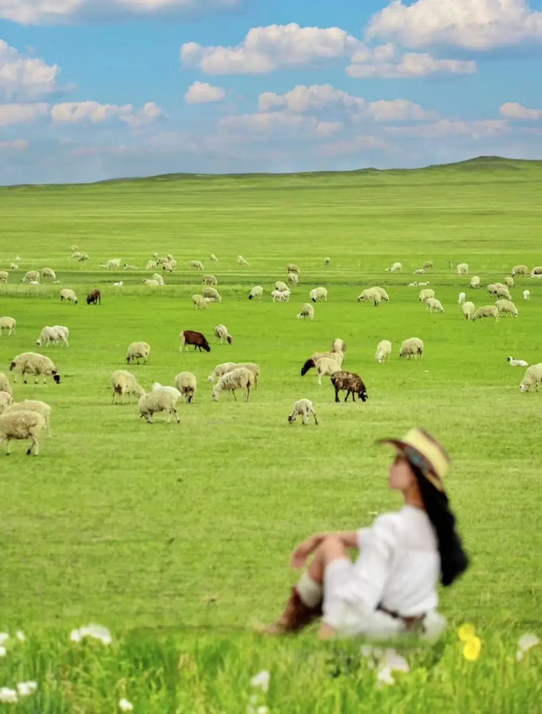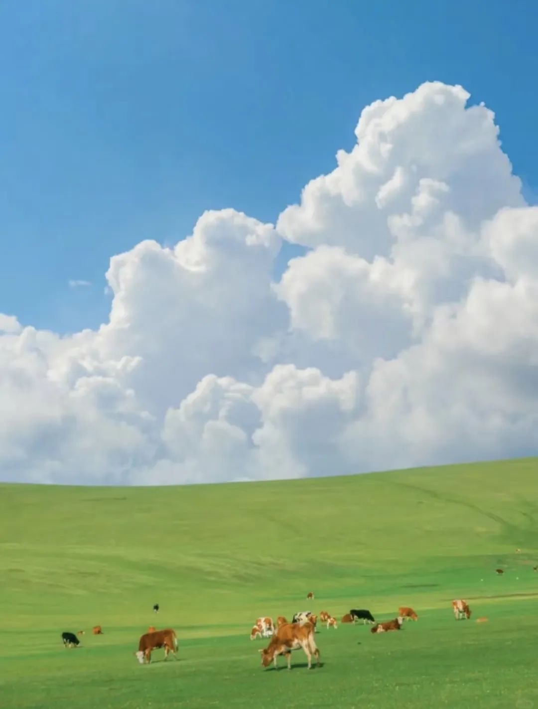 6-8月的盛夏,是内蒙草原最美的时候,云卷云舒,碧草如茵,可以去草原上肆意奔跑或躺倒。