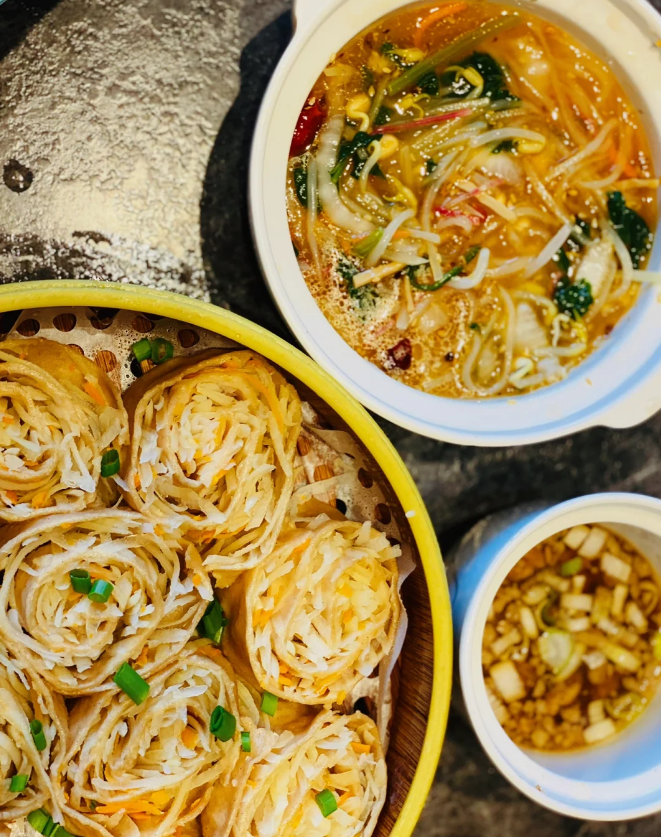 莜面鱼鱼 莜面窝窝搭配上各种蔬菜和烂糊的土豆泥 再浇上一勺半亩地秘制配汤 ,汤料也有多种选择: 热汤、凉汤、肉汤等应有尽有。我们吃上一口简直不要太满足。