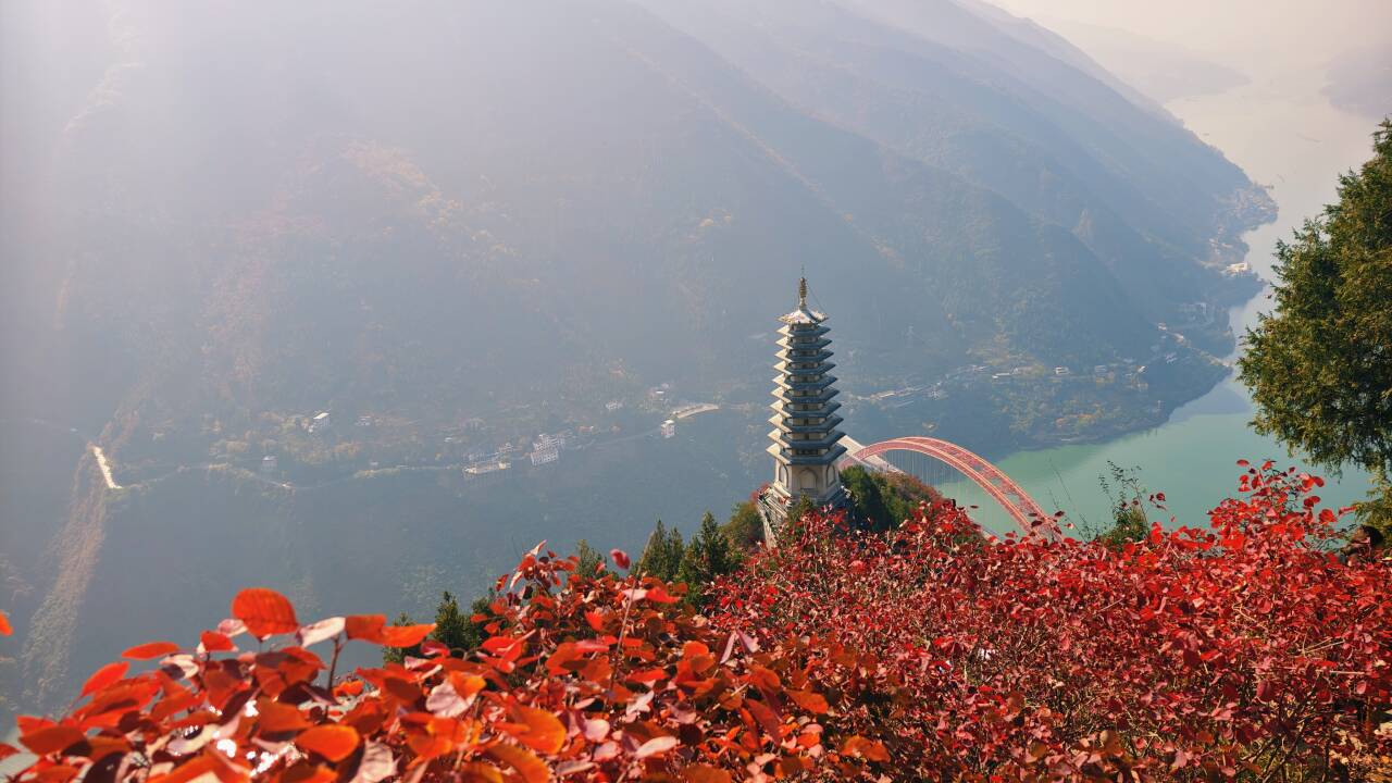 沿着健身步道拾级而上,站在观景亭内,可观秀美的巫峡、长江壮丽的高峡平湖、巫山十二峰胜景、新县城全貌。进入冬季,文峰山上漫山红遍,十分壮观。