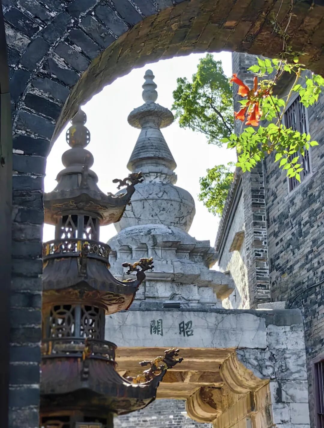 我们穿过斑驳的石阶,第一眼便是那座元代的昭关石塔,古朴而静谧。塔下是清风流转的巷道,塔身刻满了古老的佛语:“同登觉路,共渡慈航”——一语道尽百年信仰与人间愿景。
