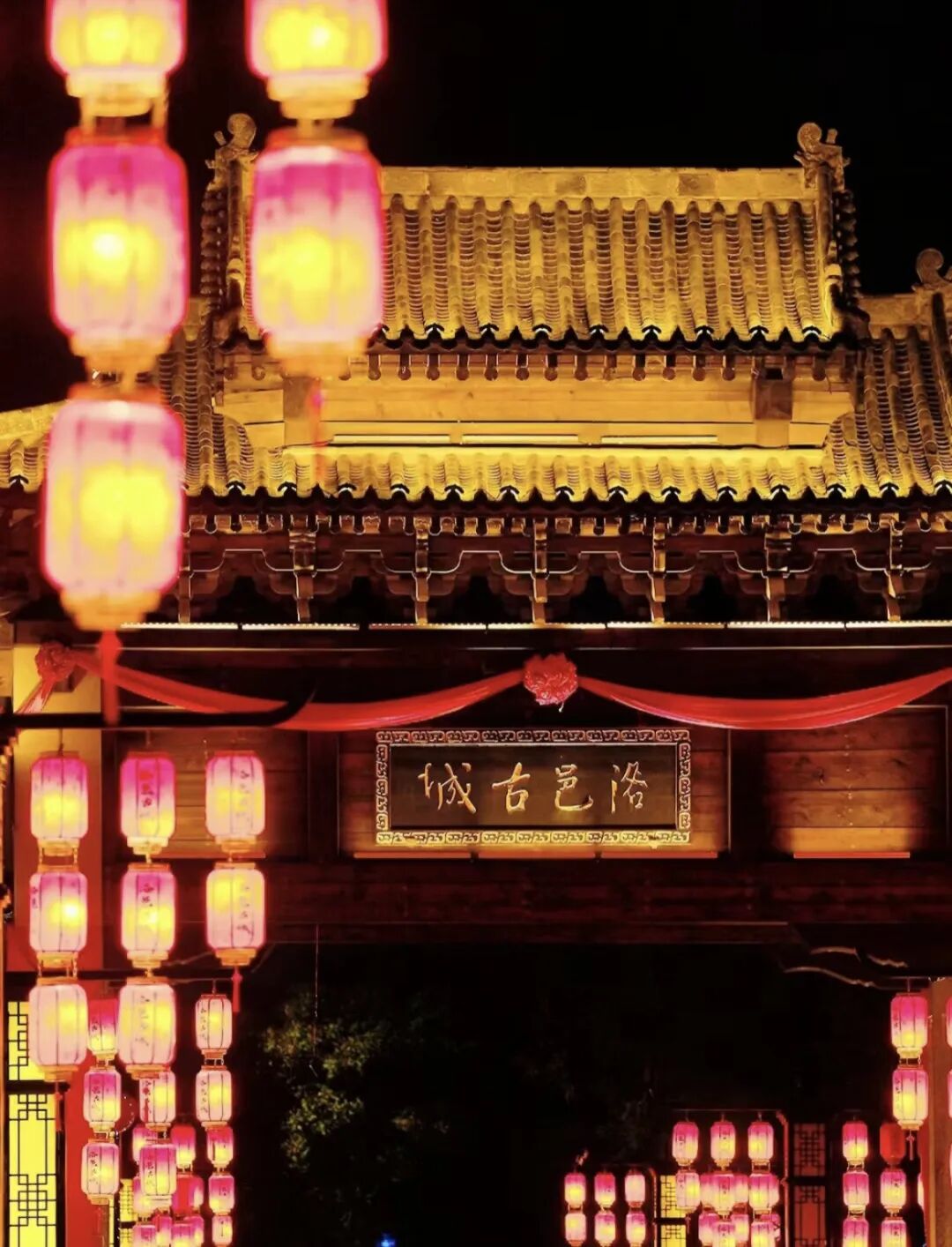 灯火辉煌的仿古建筑,飞檐翘角在夜色中勾勒出优美线条,灯光如星,点亮每一处雕梁画栋,这里,就是洛阳的夜。