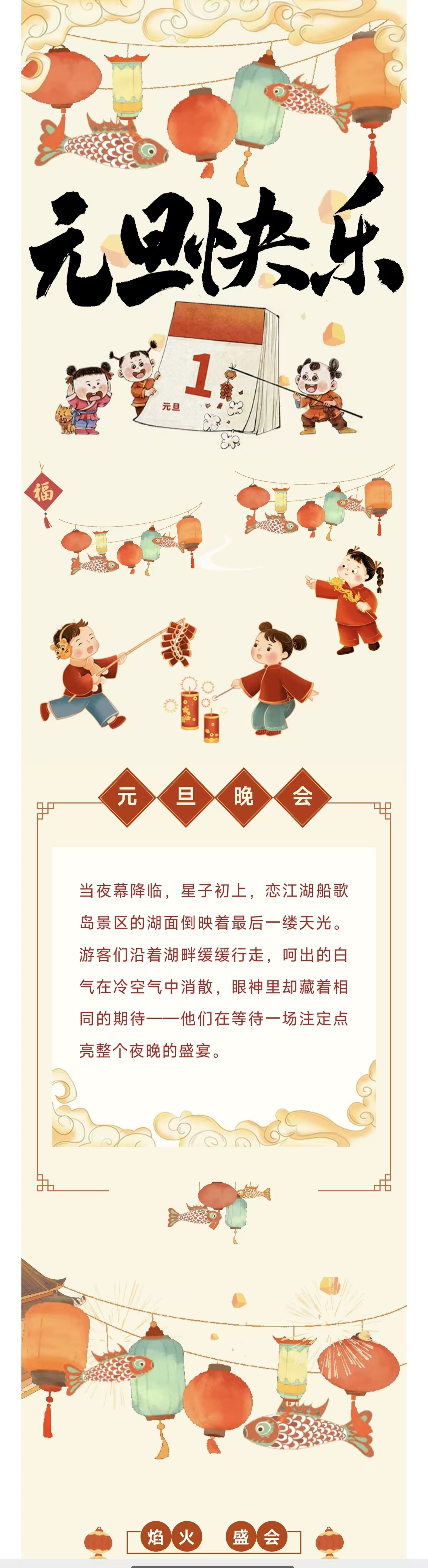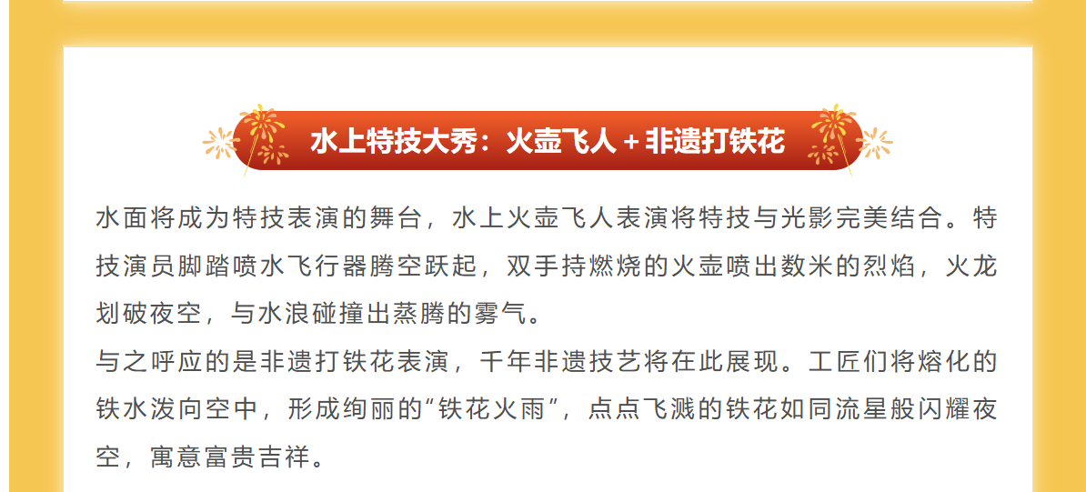 19:30-21:00分为6个篇章燃放,天幕为画,焰火作诗,浏阳烟花秀,颠覆你对夜空的想象;当第一束光刺破黑夜,屏住呼吸,下一秒/整片天空沦为浏阳的画布!万朵金菊凌空怒放,银河瀑布倾汽而下,火凤凰展翅掠过城市之巅……这是烟花,更是一场360”沉浸式视觉史诗中间穿插乐队演出和无人机表演
